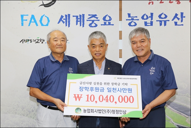 ¹®Á¤¿ì ±Ý»ê±º¼ö¿Í Á¶½Å¿µ ÀåÇÐÀç´ÜÀÌ»çÀå, °­¿ø±¸ ´ëÇ¥°¡ Âü¼®ÇÑ °¡¿îµ¥ ¿­¸° ±âŹ½Ä¿¡¼­ °­ ´ëÇ¥´Â ±Ý»ê »ç¶ûÀÇ »ó¡Àû ÀǹÌÀÎ 1004¸¸¿ø ÀåÇбÝÀ» Àü´ÞÇß´Ù.