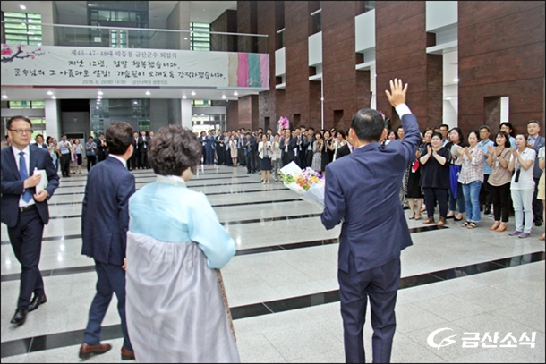 ¹Ú¿µÇÏ ÀÚÄ¡ÇàÁ¤°úÀåÀÇ »çȸ, ±è±Íµ¿ ±âȹ½ÇÀåÀÇ ÁÖ¿ä¾÷Àû¼Ò°³, °øº¸ÆÀ¿¡¼ Á¦ÀÛÇÑ ¹ßÀÚÃ뿵»ó »ó¿µ, ³²±Ã¿µ µµÁö»ç ±ÇÇÑ ´ëÇàÀÇ °ø·ÎÆÐ¸¦ ±Ý»êÃâ½Å °íÀÏȯ º¸°Çº¹Áö±¹ÀåÀÌ Àü´ÞÇßÀ¸¸ç, ½Å±â¿µ ºÎ±º¼ö°¡ ±Ý»ê±º °øÁ÷ÀÚ °¡Á·Àϵ¿À» ´ëÇ¥ÇØ ¹Ú ±º¼ö ºÎºÎ¿¡°Ô °¨»çÆÐ¸¦ Àü´ÞÇß´Ù.