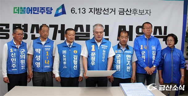 ´õºÒ¾î ¹ÎÁÖ´ç ±èÁ¤Ã¶ ¿¬¶ô¼ÒÀåÀÇ »çȸ¾Æ·¡ 29ÀÏ ¿ÀÈÄ4½Ã ¹®Á¤¿ì ±Ý»ê±º¼ö ¼±°Å»ç¹«½Ç¿¡¼­ 7¸íÀÇ Èĺ¸ÀÚµéÀÌ ¸ð¿© °ø¸í¼±°Å ¼­¾à½ÄÀ» °¡Á³´Ù.