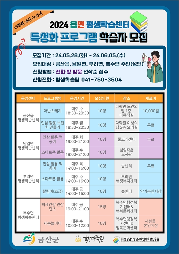 ÀÌ ÇÁ·Î±×·¥Àº Áö¿ª Ư¼ºÀ» ¹Ý¿µÇÑ Â÷º°È­µÈ Æò»ýÇнÀÀ¸·Î º¸ÆíÀû Æò»ýÇнÀ°ú ¹è¿òÀÇ °¡Ä¡¸¦ ½ÇÇöÇϱâ À§ÇØ ¸¶·ÃµÆÀ¸¸ç, ±Ý»êÀ¾°ú ³²Àϸé, ºÎ¸®¸é, º¹¼ö¸é µî 4°÷¿¡¼­ ¿ÃÇØ 12¿ù ¸»±îÁö °­Á´ç 10¸í~15¸íÀÌ Âü¿©ÇÑ °¡¿îµ¥ ¿î¿µµÈ´Ù.