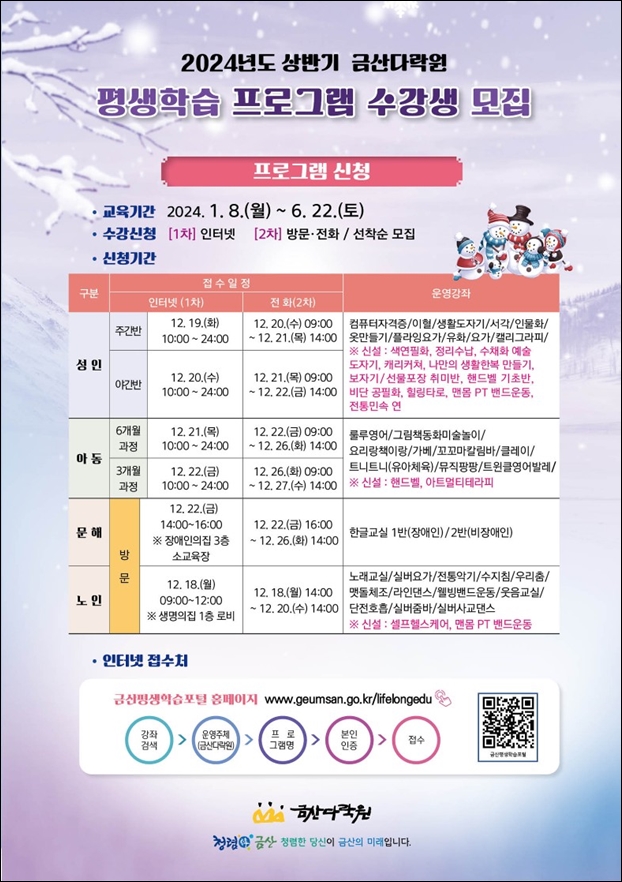 ³ëÀΰú Àå¾ÖÀÎ ÇÁ·Î±×·¥Àº ´Ù¶ô¿ø ¹æ¹® Á¢¼ö·Î ÁøÇàµÇ¸ç, ±× ¿Ü¿¡´Â ´Ù¶ô¿ø ȨÆäÀÌÁö(https://www.geumsa n.go.kr/daragwon/)¿Í ±Ý»ê±ºÆò»ýÇнÀÆ÷ÅÐ(https://www.geumsan.go.kr/lifelongedu/)¿¡¼­ ÇÒ ¼ö ÀÖ´Ù. °­Áº° ¼ö°­»ýÀº ¼±Âø¼øÀ¸·Î ¸ðÁýÇϸç Á¤¿øÀÌ ¹Ì´ÞÇÑ °­Á´ ÀüÈ­Á¢¼öµµ °¡´ÉÇÏ´Ù.