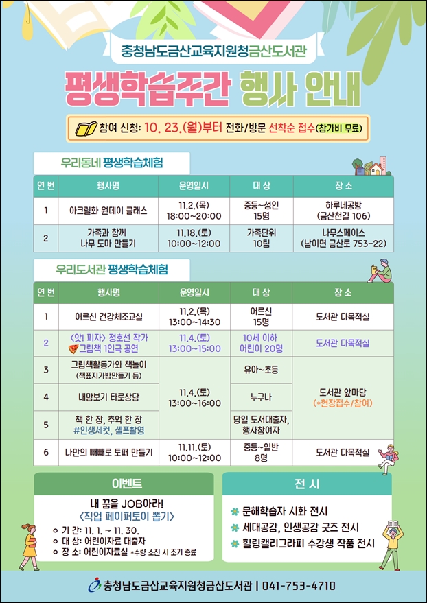 ±Ý»êµµ¼°ü¿¡¼´Â À̹ø Æò»ýÇнÀÁÖ°£¿¡ ¡®¿ì¸®µ¿³× Æò»ýÇнÀüÇ衯, ¡®¿ì¸®µµ¼°ü Æò»ýÇнÀüÇ衯À̶ó´Â 2°¡Áö ÁÖÁ¦¸¦ ¿î¿µÇÏ¸ç ¡ã¾ÆÅ©¸±È ¿øµ¥ÀÌ Å¬·¡½º ¡ã°¡Á·°ú ÇÔ²² ³ª¹« µµ¸¶ ¸¸µé±â ¡ã¾î¸£½Å °Ç°Ã¼Á¶±³½Ç ¡ã¾Ñ! ÇÇÀÚ Á¤È£¼± ÀÛ°¡ ±×¸²Ã¥ 1À뱯 °ø¿¬ ¡ã³ª¸¸ÀÇ »©»©·Î ÅäÆÛ ¸¸µé±â ¡ã¹®ÇØÇнÀÀÚ ½ÃÈ Àü½Ã µî ´Ùä·Î¿î ÇÁ·Î±×·¥À» ÁøÇàÇÑ´Ù.