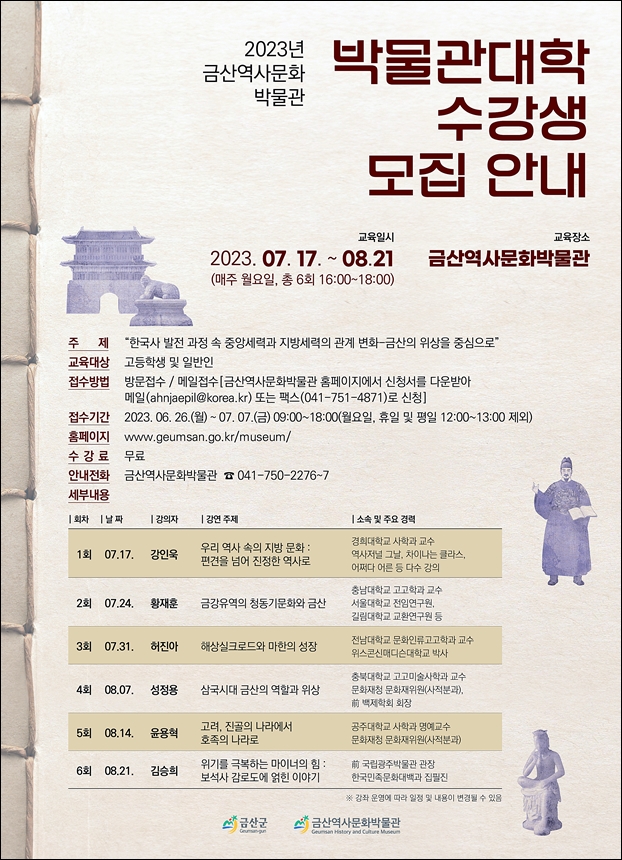ÀÌ¾î ¡ã8¿ù7ÀÏ (ÃæºÏ´ë ¼ºÁ¤¿ë °í°í¹Ì¼ú»çÇÐ ±³¼ö–»ï±¹½Ã´ë ±Ý»êÀÇ ¿ªÇÒ°ú À§»ó) ¡ã8¿ù14ÀÏ (°øÁÖ´ë À±¿ëÇõ »çÇаú ¸í¿¹±³¼ö– °í·Á,Áø°ñÀÇ ³ª¶ó¿¡¼­ È£Á·ÀÇ ³ª¶ó·Î) ¡ã8¿ù 21ÀÏ (±è½ÂÈñ Àü ±¹¸³±¤ÁÖ¹Ú¹°°üÀå–À§±â¸¦ ±Øº¹ÇÏ´Â ¸¶À̳ÊÀÇ Èû:º¸¼®»ç °¨·Îµµ¿¡ ¾ôÈù À̾߱â) µî °­Á°¡ ÁøÇàµÈ´Ù.