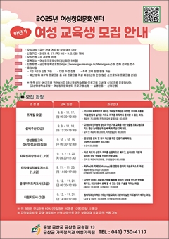 ±Ý»ê±ºÀº Áö¿ª ¿©¼ºµéÀÇ Ãë¾÷ ¿ª·®À» °­È­Çϰí â¾÷ ±âȸ¸¦ È®´ëÇϱâ À§ÇØ '2025³â ÇϹݱâ Ã롤â¾÷ ±³À°' ÇÁ·Î±×·¥À» ¿À´Â 9¿ùºÎÅÍ 11¿ù±îÁö ¿©¼ºÃ¢Àǹ®È­¼¾...