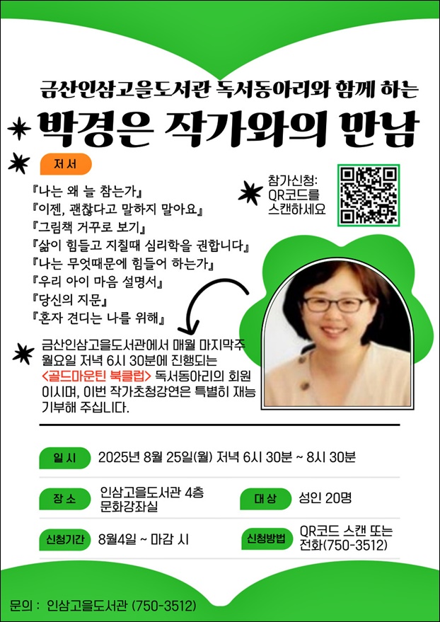 ±Ý»ê±ºÀº ÁֹεéÀÇ µ¶¼¹®È ÁøÈï°ú ÀÚ¹ßÀûÀÎ ÇнÀ °øµ¿Ã¼ Çü¼ºÀ» À§ÇØ ¿À´Â 25ÀÏ ¿ÀÈÄ 6½Ã 30ºÐºÎÅÍ 8½Ã 30ºÐ±îÁö Àλï°íÀ»µµ¼°ü 4Ãþ ¹®È°Á½ǿ¡¼ ¡®³ª´Â ¿Ö ´Ã Âü´Â°¡¡¯ÀÇ ÀúÀÚ ¹Ú°æÀº ÀÛ°¡ ÃÊû Ưº° °¿¬È¸¸¦ °³ÃÖÇÑ´Ù.