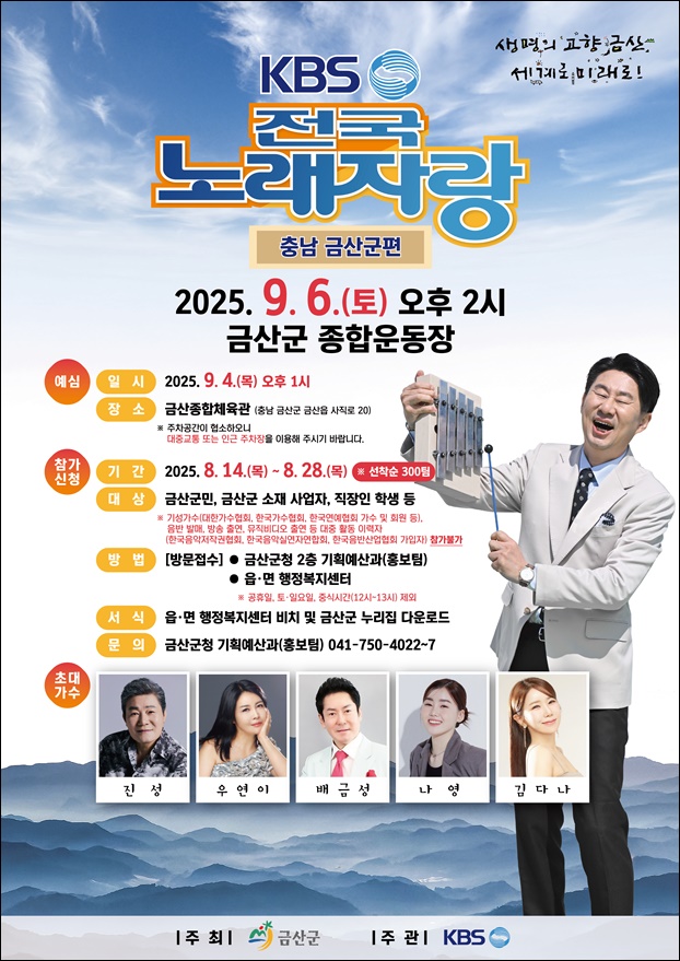 ±Ý»ê±ºÀº ¿À´Â 9¿ù 6ÀÏ ¿ÀÈÄ 2½Ã ±Ý»ê±ºÁ¾ÇտÀå¿¡¼­ KBSÇѱ¹¹æ¼Û°ø»ç°¡ ÁÖ°üÇÏ´Â ¡®KBSÀü±¹³ë·¡ÀÚ¶û¡¯ º»¼± ¹«´ë°¡ °³ÃÖµÈ´Ù°í ¹àÇû´Ù.