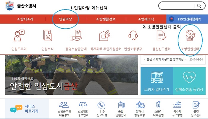 À̸¦ À§ÇØ ±Ý»ê¼Ò¹æ¼­´Â ȨÆäÀÌÁö¿¡ Á¢¼ÓÇÏ¸é ¹Î¿ø¸¶´ç ¸Þ´º¿¡¼­ ¼Ò¹æ¹Î¿ø¼¾Å͸¦ Ŭ¸¯, Á÷Á¢ °Ë»öÇÏÁö ¾Ê°í ¼Ò¹æ¹Î¿ø¼¾ÅÍ È¨ÆäÀÌÁö¸¦ ¹æ¹®ÇÒ ¼ö ÀÖµµ·Ï ȨÆäÀÌÁö¸¦ ¿î¿µÇϰí ÀÖ´Ù.