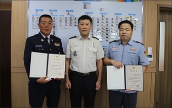 ¡ã¼Ò¹æÃ»Àå ǥâÀ» ¼ö»óÇÑ Áø»ê¸é Àü´ãÀÇ¿ë¼Ò¹æ´ë ÃÖÀçºÀ ´ëÀå(¿ÞÂÊ), ¹ÚÁø¼­ Ãѹ«ºÎÀå(¿À¸¥ÂÊ)°ú ±ÇÁÖÅ ¼ö¹æ¼­Àå. ±Ý»ê¼Ò¹æ¼­´Â ¼Ò¼Ó ÀÇ¿ë¼Ò¹æ´ë°Å µ¿Àý±â Æø¼³ ...