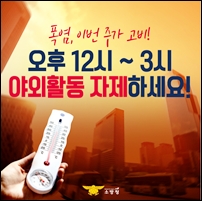 ¿Â¿­ Áúȯ ¿¹¹æÀ» À§Çؼ­´Â ¿ÀÈÄ 12½Ã¿¡¼­ 3½Ã »çÀÌ¿¡´Â ¾ß¿Ü Ȱµ¿À» ÀÚÁ¦ÇÏ°í ºÎµæÀÌ ¿ÜÃâÇÒ °æ¿ì¿¡´Â ½Ã¿øÇÑ ¿Ê°ú ¸ðÀÚ, ¾ç»ê, ¹° µîÀ» ÈÞ´ëÇÏ¿© ÀûÁ¤ ü¿ÂÀ» À¯ÁöÇϰí ÃæºÐÇÑ ¼öºÐÀ» ¼·ÃëÇØ¾ßÇÑ´Ù.
