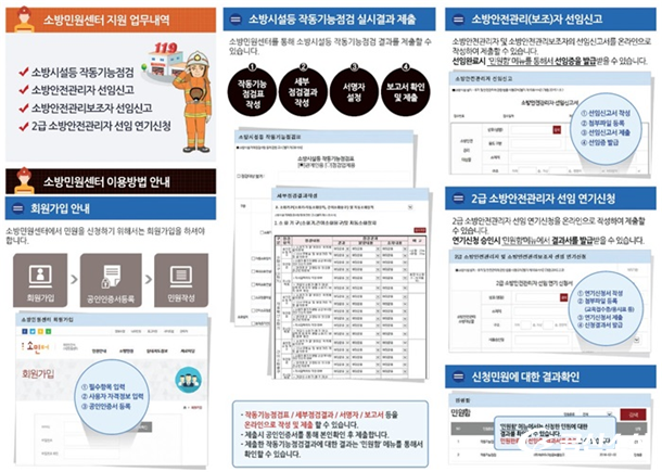 ¾ÕÀ¸·Î ¼Ò¹æ½Ã¼³ ÀÛµ¿±â´ÉÁ¡°Ë °á°ú Á¦Ãâ ¹× ¼Ò¹æ¾ÈÀü°ü¸®ÀÚ ¼±ÀӽŰí¿Í °ü·ÃÇÑ ¹Î¿ø¾÷¹«¸¦ ½ÅûÀº ¼Ò¹æ¹Î¿ø¼¾Å͸¦ ÀÌ¿ëÇÏ¸é °üÇÒ  ¼Ò¹æ¼­ ¹æ¹® ¾øÀÌ ÀÎÅͳÝÀ¸·Î ¹Î¿ø¾÷¹«¸¦ ½ÅûÇÒ ¼ö ÀÖÀ¸¸ç, ÇØ´ç ¾÷¹«ÀÇ ÁøÇà»óȲ°ú 󸮰á°ú¸¦ Á÷Á¢ È®ÀÎÇÒ ¼ö ÀÖ´Ù.