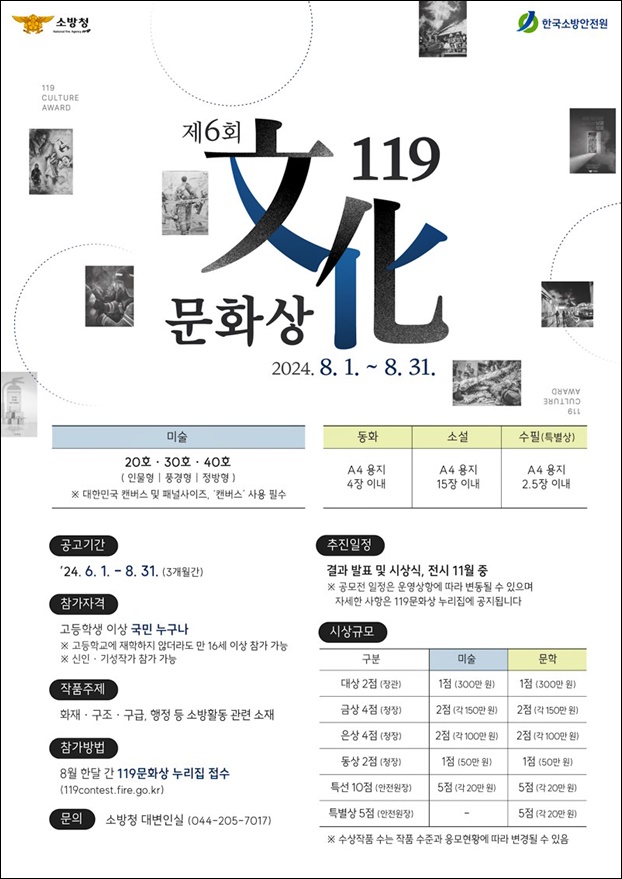 Á¢¼ö´Â 8¿ù ´Þ°£ 119¹®È­»ó ´©¸®Áý¿¡¼­ Á¢¼ö °¡´ÉÇÏ´Ù. ÀÚ¼¼ÇÑ ³»¿ëÀº 119¹®È­»ó ´©¸®Áý(119contest.fir e.go.kr) ¶Ç´Â ¼Ò¹æÃ» ´ëº¯ÀνÇ(044-205-7017)¿¡¼­ È®ÀÎÇÒ ¼ö ÀÖ´Ù.