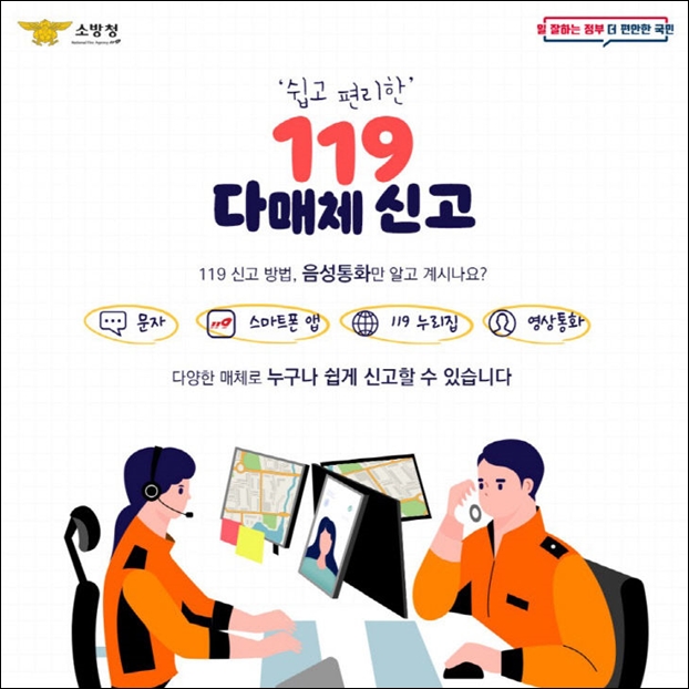 119 ´Ù¸Åü ½Å°í ¼­ºñ½º´Â À½¼ºÅëÈ­»Ó¸¸ ¾Æ´Ï¶ó ¡ã¹®ÀÚ½Å°í ¡ã ¾Û È°¿ë ÅÍÄ¡ ½Å°í ¡ãÀÎÅÍ³Ý ½Å°í(www .119.go.kr)  ¡ã¿µ»óÅëÈ­ ½Å°í µî Æí¸®ÇÔÀ» Á¦°øÇÑ´Ù.