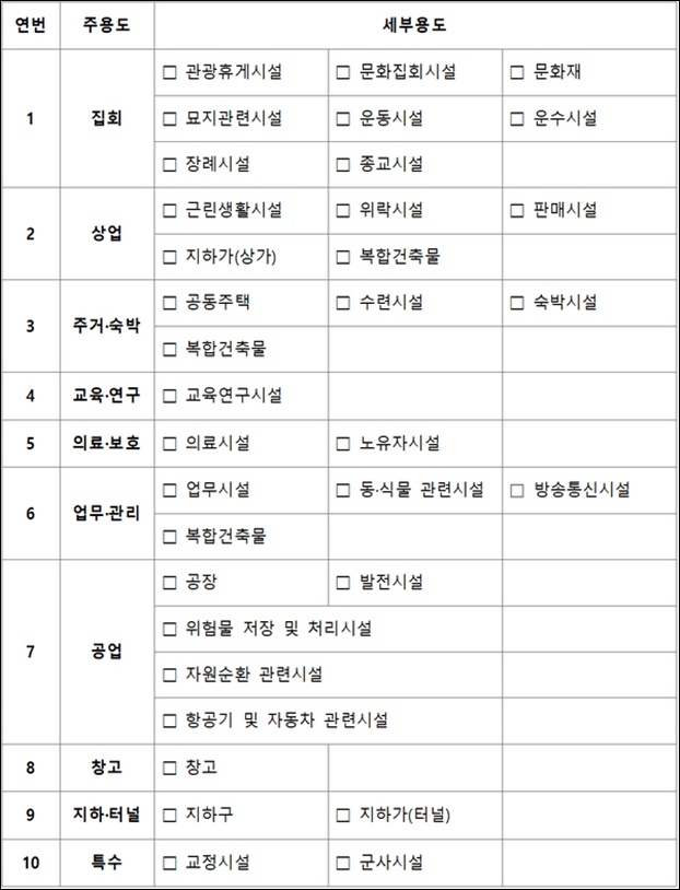 ±âÁ¸ ¼Ò¹æ°èȹ¼­´Â ¼Ò¹æ ´ë»ó¹°ÀÇ ±Ô¸ð¿¡ µû¶ó ±âÁ¸ Ư¡¤1±Þ°ú 2¡¤3±ÞÀ¸·Î ³ª´µ¾î ÀÖ¾úÁö¸¸, À̹ø¿¡ ¾ç½ÄÀ» °ÇÃ๰ Ư¼º¿¡ µû¶ó ¿ëµµº° 10°¡Áö(Áýȸ, »ó¾÷, ÁÖ°Å¡¤¼÷¹Ú µî)·Î ¼¼ºÐÈ­ÇØ °³Á¤Çß´Ù.