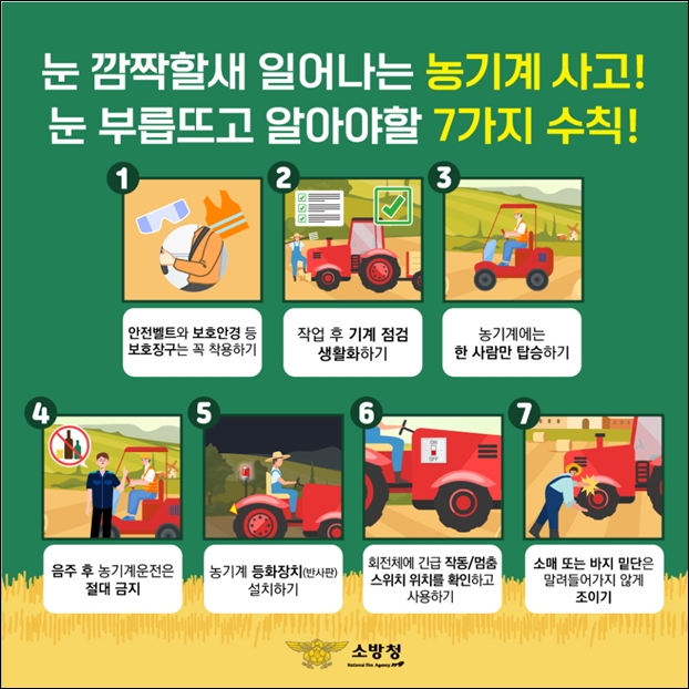 ÀÌ¿Í °ü·Ã¿¡ ¼Ò¹æ¼¿¡¼´Â ³ó±â°è ¾ÈÀü»ç°í ¿¹¹æÀ» À§ÇØ ¡ãÀÛ¾÷ Àü¡¤ÈÄ Àåºñ Á¡°Ë ¡ãÀÛ¾÷¿¡ ÀûÇÕÇÑ º¹Àå ¹× º¸È£±¸ Âø¿ë ¡ãÀ½ÁÖ ÈÄ ³ó±â°è ¿îÀü ±ÝÁö ¡ã¾ß°£ ¹Ý»çÆÇ ¹× µîÈ ÀåÄ¡ ºÎÂø ¡ã¿îÀü ½Ã¾ß È®º¸¸¦ ¿ì¼±ÇØ ¹°°Ç ÀûÀçÇÏ±â µî ¾ÈÀü ¼öÄ¢À» ÁؼöÇØ¾ß ÇÑ´Ù°í °Á¶Çß´Ù.