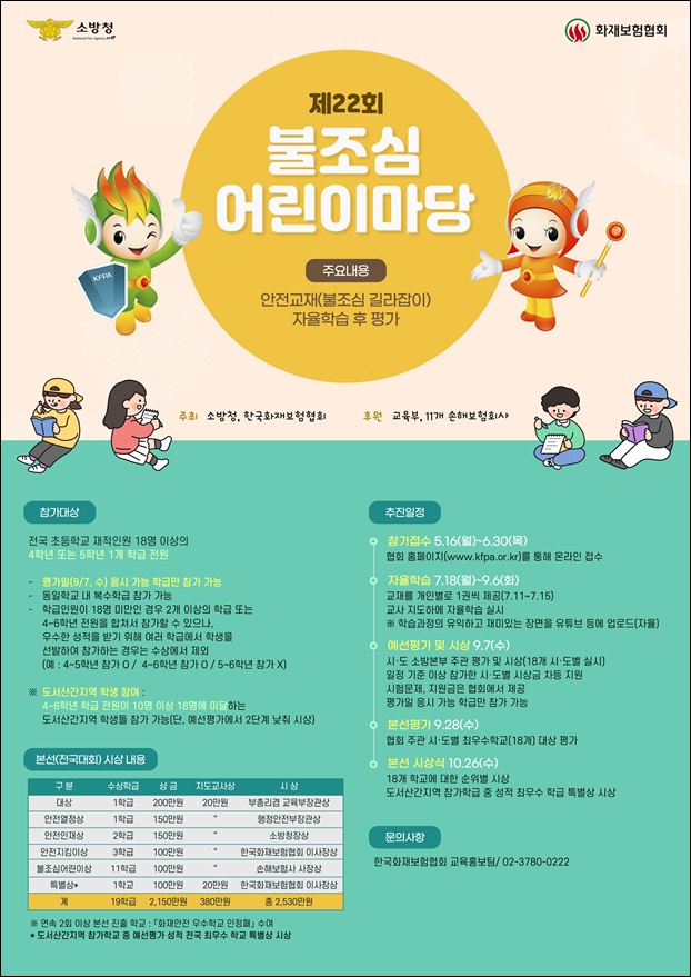 ¡®ºÒÁ¶½É ¾î¸°ÀÌ ¸¶´ç¡¯Àº Çѱ¹È­À纸ÇèÇùȸ¿Í ¼Ò¹æÃ»ÀÌ ÁÖÃÖÇÏ°í ±³À°ºÎ¿Í 11°³ ¼ÕÇØº¸Çè»ç°¡ ÈÄ¿øÇÏ´Â Çà»ç·Î, Âü°¡ ÇбÞÀÌ È­Àç¿Í ÀÚ¿¬Àç³­ ¹× »ýȰ¾ÈÀü¿¡ °üÇÑ ±âÃÊÁö½ÄÀ» ÇнÀ°ú Æò°¡¸¦ ÅëÇØ ¾ÈÀü¹®È­ È®»ê¿¡ ±â¿©Çϱâ À§ÇØ ½Ç½ÃµÇ°í ÀÖ´Ù.