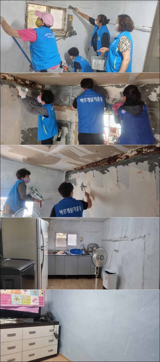 ÀÌÆ²°£ ÀÌ È¸Àå°ú ȸ¿øµé ¿À·¡µÈ ½Ç³»ÀÇ ÁÖ¹æ º®À» ±ú²ýÇÏ°Ô Á¤¸®ÇÑ ÈÄ ÆäÀÎÆ®¸¦ Ä¥ÇØ º¸±â ÁÁ°Ô ¸¶¹«¸®ÇßÀ¸¸ç, ¹æ¾ÈÀÇ ³°Àº º®Áö¸¦ ¶¼¾î³»°í »õ º®Áö·Î µµ¹è¸¦ Çϰí ÀåÆÇµµ ±³Ã¼ÇÏ¸ç »ç·ÊÀÚ¿¡°Ô ±ú²ýÇÑ ¹æÀ» ¼±¹°Çß´Ù. ¶ÇÇÑ Áý¾È°ú ¸¶´ç¿¡ ³ÊÀúºÐÇÏ°Ô ¹ö·ÁÁø ¾²·¹±âµµ ±ú²ýÇÏ°Ô Ã»¼ÒÇß´Ù.