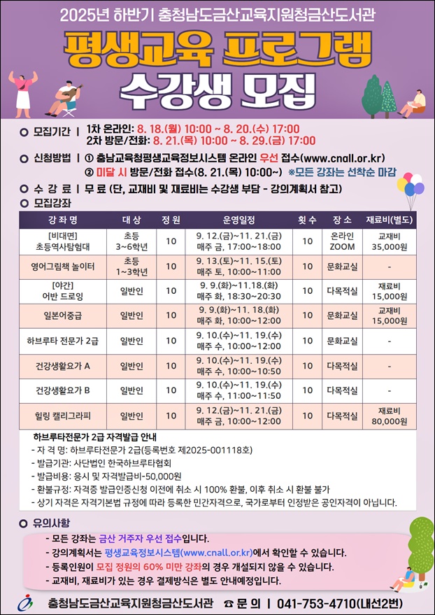 ±Ý»êµµ¼­°üÀº Áö¿ª ÁÖ¹ÎÀÇ Æò»ýÇнÀ ±âȸ¸¦ È®´ëÇÏ°í °ÇÀüÇÑ ¿©°¡¹®È­¸¦ Á¶¼ºÇϱâ À§ÇØ ¡®2025³â ÇÏ¹Ý±â Æò»ý±³À° ÇÁ·Î±×·¥¡¯À» ¿î¿µÇÑ´Ù.
