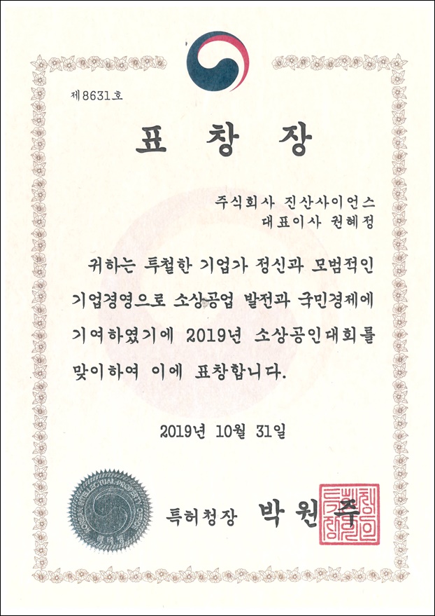 ±Ý»ê±º ±ººÏ¸é¿¡ ¼ÒÀçÇÑ (ÁÖ)Áø»ê»çÀ̾ð½º(´ëÇ¥ ±ÇÇýÁ¤, Ãæ³² ±Ý»ê±º ±ººÏ¸é ¼Û¸²±æ 167)°¡ Áö³´Þ 31ÀÏ °æ±âµµ ÀÏ»ê ŲŨ½º¿¡¼ ¿¸° ¡®2019 ´ëÇѹα¹ ¼Ò»ó°øÀÎ ´ëȸ¡¯¿¡¼ ƯÇãûÀå Æ÷»óÀ» ¹Þ¾Æ ±Ý»ê ¼Ò»ó°øÀÎÀÇ ÈûÀ» Àü±¹¿¡ ¾Ë·È´Ù.