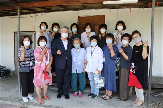 ¡ã¹®Á¤¿ì ±Ý»ê±º¼ö(¾ÕÁÙ ¿ÞÂÊ¿¡¼­ ¼¼ ¹øÂ°)¿Í ³ëÀθÂÃãµ¹º½ »ýȰÁö¿ø»çµéÀÌ ¾î¸£½Å¿¡°Ô ¸¶½ºÅ©¸¦ Àü´ÞÇÑ ÈÄ ±â³äÃÔ¿µÀ» ÇÏ´Â ¸ð½À. ¨Ï±Ý»ê±ºÃ»