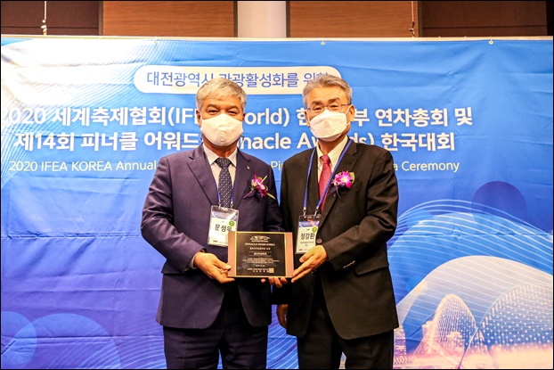 ¡ã¹®Á¤¿ì ±Ý»ê±º¼ö(¿ÞÂÊ)¿Í ¼¼°èÃàÁ¦Çùȸ Çѱ¹ÁöºÎ Á¤°È¯ ȸÀå(¿À¸¥ÂÊ)ÀÌ ¡®ÇdzªÅ¬ ¾î¿öµå Çѱ¹´ëȸ¡¯ µðÀÚÀι° ºÎ¹® ±Ý»ó ¼ö»ó ±â³ä»çÁøÀ» ÃÔ¿µÇÏ´Â ¸ð½À. ¨Ï±Ý»ê±ºÃ»