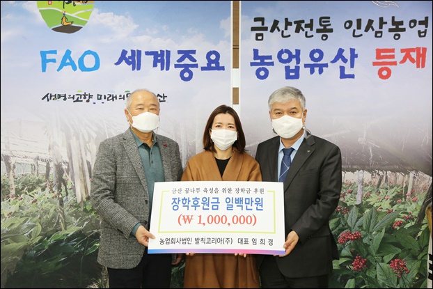 À̳¯ ±Ý»êÀ¾¿¡ ¼ÒÀçÇÑ ³ó»ê¹° À¯Åë ¹× Á¦Á¶¾÷ü ¹ßÄ¢ÄÚ¸®¾Æ(´ëÇ¥ ÀÓÈñ°æ)´Â ±Ý»ê ²Þ³ª¹« À°¼ºÀ» À§ÇØ 100¸¸ ¿øÀÇ ÀåÇÐÈÄ¿ø±ÝÀ» ±Ý»ê±³À°»ç¶ûÀåÇÐÀç´Ü¿¡ ±âŹÇß´Ù.