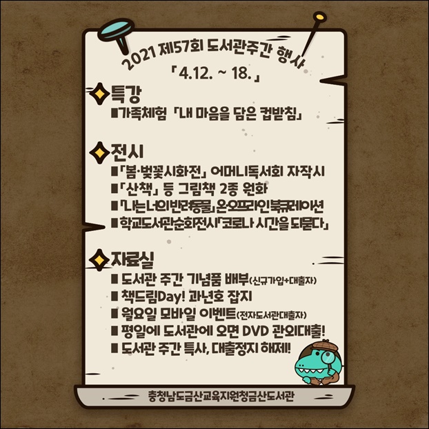 À̹ø Çà»ç´Â ¡ãüÇè:³»¸¶À½À» ´ãÀº ÄŹÞħ ¸¸µé±â ¡ãÀü½Ã: µ¶¼È¸ º½º¢²É½ÃÈÀü, ±×¸²Ã¥¿øÈ, ¡®³ª´Â ³ÊÀÇ ¹Ý·Áµ¿¹°¡¯¿Â¡¤¿ÀÇÁ¶óÀÎ ºÏÅ¥·¹ÀÌ¼Ç ¡ã¡®Äڷγª, ½Ã°£À» µÇ¹¯´Ù¡¯Çб³µµ¼°ü ¼øÈ¸Àü½Ã ¡ãÀÚ·á½Ç Çà»ç:½Å±Ô°¡ÀÔÀÚ ±â³äǰ ¹èºÎ, °ú³âÈ£ÀâÁö Ã¥µå¸²Çà»ç, ÀüÀÚµµ¼°ü ¿ì¼öÀÌ¿ëÀÚ »óǰ Àü´Þ, ÆòÀÏ µµ¼°ü ÀÌ¿ëÀÚ DVD´ëÃâ, µµ¼°üÁÖ°£ ±â°£ ´ëÃâÁ¤Áö ÇØÁ¦ µî µµ¼°üÀ» ¾Ë¸®°í ÀÌ¿ë Ȱ¼ºÈ¸¦ À§ÇÑ ³»¿ëÀ¸·Î ±¸¼ºµÆ´Ù.