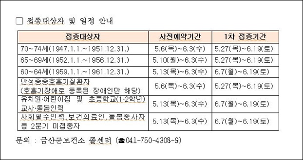 Á¢Á¾À» ¹Þ±â À§Çؼ´Â ´ë»óÀÚº°·Î 5¿ù 6ÀϺÎÅÍ 6¿ù 3ÀϱîÁö »çÀü¿¹¾àÀ» ÇØ¾ß ÇÑ´Ù. ÃÑ 2ȸ Á¢Á¾¹ÞÀ» Çʿ䰡 ÀÖ°í Á¢Á¾°£°ÝÀº 11~12ÁÖ´Ù.