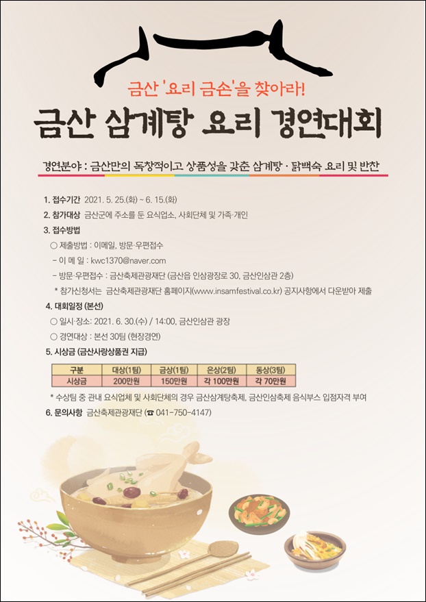 ±Ý»ê »ï°èÅÁ ¿ä¸® °æ¿¬´ëȸ¿¡ ´ëÇÑ ÀÚ¼¼ÇÑ ³»¿ëÀº Àç´ÜȨÆäÀÌÁö(www.insamfestival.co.kr) °øÁö»çÇ×À» Âü°íÇϰųª »ç¹«±¹(¢Ï041- 750-4147)¿¡ ¹®ÀÇÇÏ¸é µÈ´Ù.