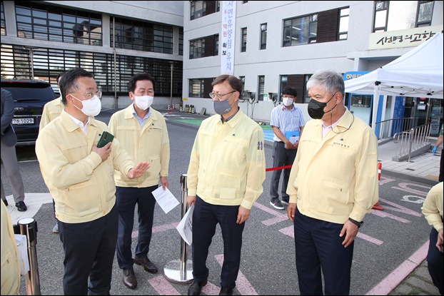 ¡ã¹®Á¤¿ì ±Ý»ê±º¼ö(¿À¸¥ÂÊ Ã¹ ¹øÂ°)°¡ À̽¿ì Àç³¾ÈÀü°ü¸®º»ºÎÀå(¿ÞÂÊ Ã¹ ¹øÂ°)°ú ±Ý»ê±ºº¸°Ç¼Ò ¹æ¿ª ÇöÀåÀ» Á¡°ËÇÏ´Â ¸ð½À. ¨Ï±Ý»ê±ºÃ»
