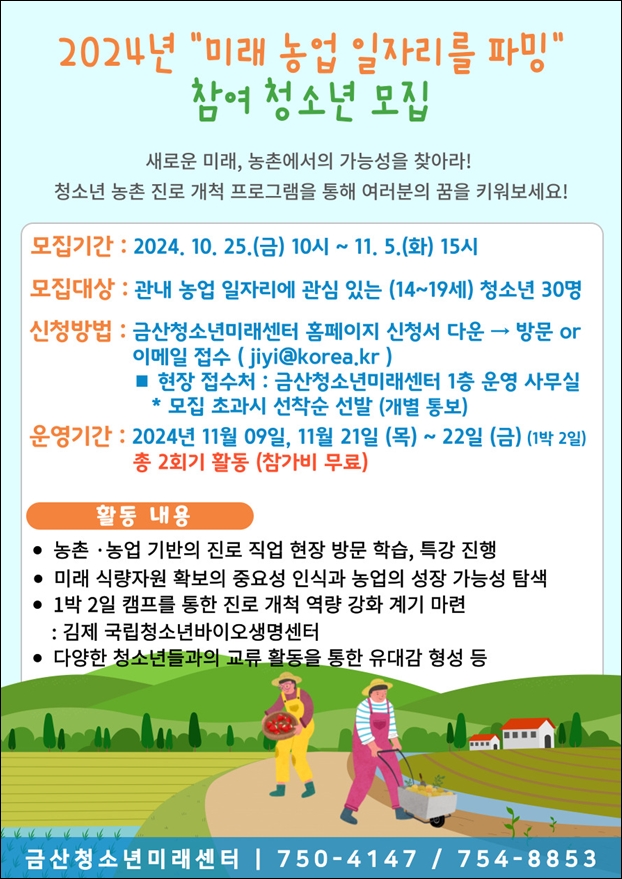 Âü°¡ºñ´Â ¹«·áÀ̸ç, ³óÃÌ‧³ó¾÷ ±â¹Ý Áø·Î Á÷¾÷ ÇöÀå ÇнÀ ¹× Ư°°ú ÇÔ²² °°Àº Áø·Î¸¦ °èȹÇϴ û¼Ò³â °£ ±³·ù Ȱµ¿µµ Áö¿øÇÑ´Ù.