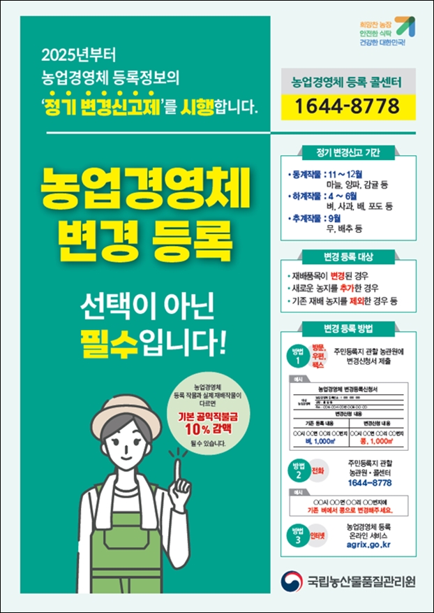 ±Ý»ê ³ó°ü¿ø ±èÁ¾¿ì »ç¹«¼ÒÀåÀº ¡°°æ¿µÃ¼ µî·ÏÁ¤º¸ÀÇ Á¤È®µµ¸¦ ³ôÀÌ·Á¸é ³ó¾÷ÀÎÀÇ Àû±ØÀûÀÎ Âü¿©°¡ ÇʼöÀû¡±À̶ó°í °Á¶ÇÏ¸ç ¡°Àç¹èǰ¸ñÀ̳ª ³óÁö°¡ º¯°æµÇ¸é À̹ø Á¤±â º¯°æ ½Å°í±â°£¿¡ ²À ½Å°íÇØ ´Þ¶ó¡±°í ´çºÎÇÏ¿´´Ù.