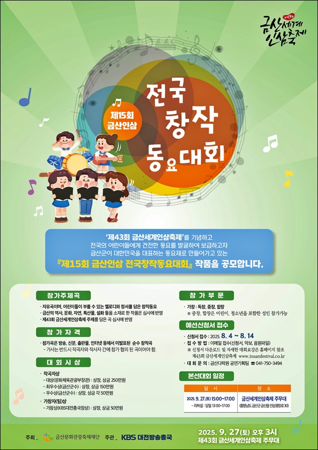 ±Ý»ê±ºÀÌ Àü±¹ÀÇ ¾î¸°À̵鿡°Ô °ÇÀüÇÑ µ¿¿ä¸¦ ¹ß±¼ÇÏ°í º¸±ÞÇϱâ À§ÇØ ¿À´Â 9¿ù 27ÀÏ ±Ý»ê¼¼°èÀλïÃàÁ¦Àå ÁÖ¹«´ë¿¡¼ ¡®Á¦15ȸ ±Ý»êÀλï Àü±¹Ã¢ÀÛµ¿¿ä´ëȸ¡¯¸¦ °³ÃÖÇÑ´Ù.
