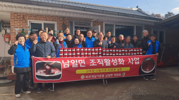 ¹Ù¸£°Ô»ì±â¿îµ¿ ³²ÀϸéÀ§¿øÈ¸(À§¿øÀå °û³²¿ë)´Â ³²Àϸé Á¶Á÷Ȱ¼ºÈ­ »ç¾÷ÀÇ ÀÏȯÀ¸·Î ¡®°íÃßÀå ³ª´®À¸·Î µû¶æÇÑ ½Çõ¡¯ Çà»ç¸¦ ÁøÇàÇϸç Áö¿ªÀÇ ¾î·Á¿î ÀÌ¿ô¿¡°Ô ¿ÂÁ¤À» ÀüÇß´Ù.