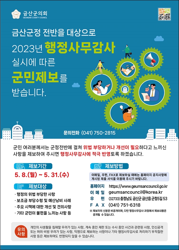 ÇÑÆí, °³ÀÎÀÇ »ç»ýȰÀ» Ä§ÇØÇÒ ¿ì·Á°¡ ÀÖ´Â »çÇ×, °è¼Ó ÁßÀÎ ÀçÆÇ ¶Ç´Â ¼ö»ç ÁßÀÎ »ç°Ç°ú °ü·ÃµÈ »çÇ×, ÀνŰø°Ý ¶Ç´Â ÇãÀ§¡¤ºñ¹æ ¿ì·Á°¡ ÀÖ´Â »çÇ×, À͸íÀ¸·Î Á¦º¸ÇÏ´Â »çÇ×À̳ª ±âŸ ÇàÁ¤»ç¹«°¨»ç·Î ó¸®Çϱ⠺ÎÀûÀýÇÑ »çÇ× µîÀº Á¦º¸ÇÏ¿©µµ ¹Ý¿µµÇÁö ¾ÊÀ» ¼ö ÀÖÀ¸¸ç ±º¹ÎÁ¦º¸¿¡ ´ëÇÑ ¹®ÀÇ»çÇ×Àº ±Ý»ê±ºÀÇȸ(¢Ï 041-750-2815)·Î ÀüÈÇÏ¸é µÈ´Ù.