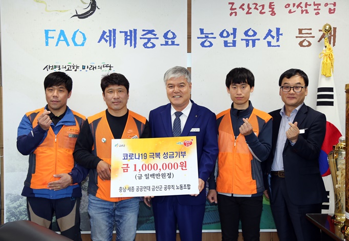 Ãæ³²¡¤¼¼Á¾ °ø°ø¿¬´ë ±Ý»ê±º°ø¹«Á÷³ëµ¿Á¶ÇÕ(À§¿øÀå ¹Ú¹üÈ«)Àº Áö³­14ÀÏ Äڷγª19 È®»ê¹æÁö¿Í À§±â±Øº¹À» À§ÇÑ ¼º±Ý 100¸¸ ¿øÀ» ±Ý»ê±º¿¡ ±âŹÇß´Ù°í ¹àÇû´Ù.