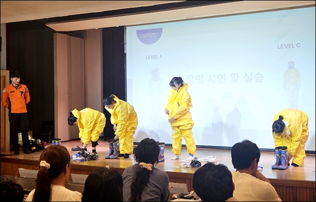 ¼¼ºÎ ÃßÁø °úÁ¤À¸·Î ¡ã»ý¹°Å×·¯ ´ëÀÀ ±âº» ±³À° ¡ã°³Àκ¸È£±¸(Level A, C) Âø¡¤Å»ÀÇ ½Ç½À ¡ã´ÙÁߎÁöŰƮ Ȱ¿ë ¹× °Ëü Æ÷À塤ÀÌ¼Û ÀýÂ÷ ½Ç½À µîÀÌ ÁøÇàµÆÀ¸¸ç, Âü°¡ÀÚµéÀº »óȲº° ´ëÀÀ ÀýÂ÷¸¦ ¼÷ÁöÇÏ°í ½ÇÀü °¨°¢À» ÀÍÇû´Ù.