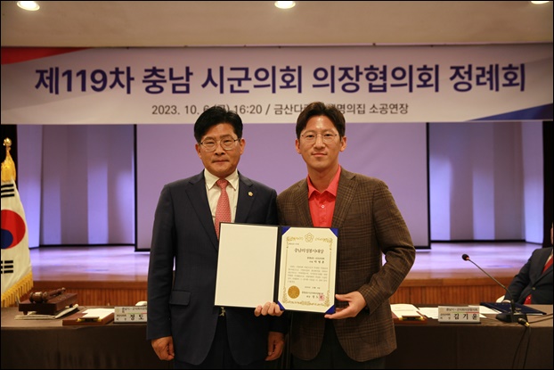 Ãæ³²ÀÇ °¢ ½Ã¡¤±º Áö¹æÀÇȸ 170¿© ¸íÀÇ ÀÇ¿ø Áß ¸Å´Þ 1¸íÀÇ ÀÇ¿ø¿¡°Ô ÁÖ¾îÁö´Â Ãæ³²ÀÇÁ¤ºÀ»ç´ë»óÀº ±Ý»ê±ºÀÇȸ ¹Úº´ÈÆ °æÁ¦»ê¾÷À§¿øÀå(»çÁø ÇÏ´Ü ¿À¸¥ÂÊ)ÀÌ ¼ö»óÇß´Ù.