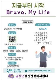±Ý»ê±ºÁ¤½Å°Ç°­º¹Áö¼¾ÅͰ¡ ¿À´Â 8¿ù25ÀϺÎÅÍ 26ÀϱîÁö ³²ÀÌ¸é »ê¸²¹®È­Å¸¿î¿¡¼­ Áß¡¤Àå³â ³²¼ºµéÀÇ Á¤½Å°Ç°­À» À§ÇÑ Èú¸µ ÇÁ·Î±×·¥ ¡®Bravo My Life¡¯¸¦ ...