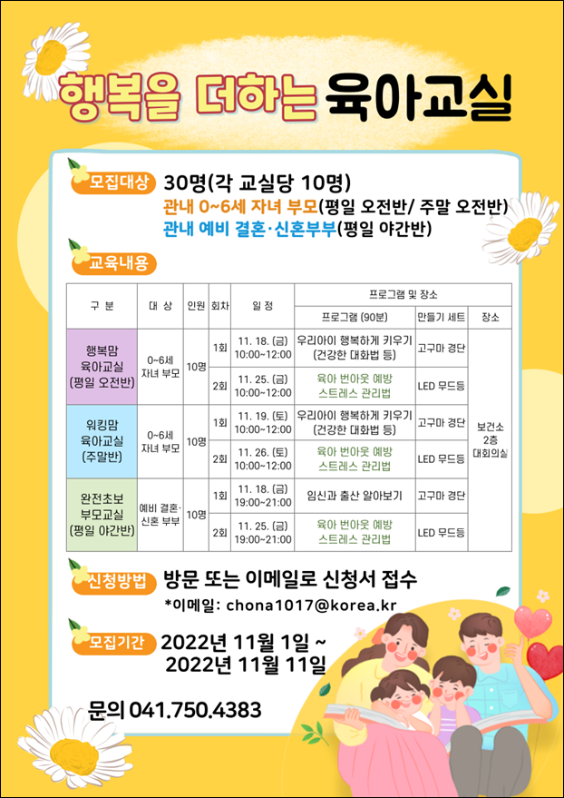 À̹ø ±³À°Àº ¡ãÇູ¸¾ À°¾Æ±³½Ç(ÆòÀÏ ¿ÀÀü¹Ý) ¡ã¿öÅ·¸¾ À°¾Æ±³½Ç(ÁÖ¸»¹Ý) ¡ã¿ÏÀüÃʺ¸ ºÎ¸ð±³½Ç(ÆòÀÏ ¾ß°£¹Ý) µî ÃÑ 3°³ ÇÁ·Î±×·¥ÀÌ ÁøÇàµÇ¸ç, À°¾Æ ¹ø¾Æ¿ô ¿¹¹æ ½ºÆ®·¹½º °ü¸®¹ý °Àǰ¡ °øÅëÀ¸·Î Æ÷ÇԵƴÙ.