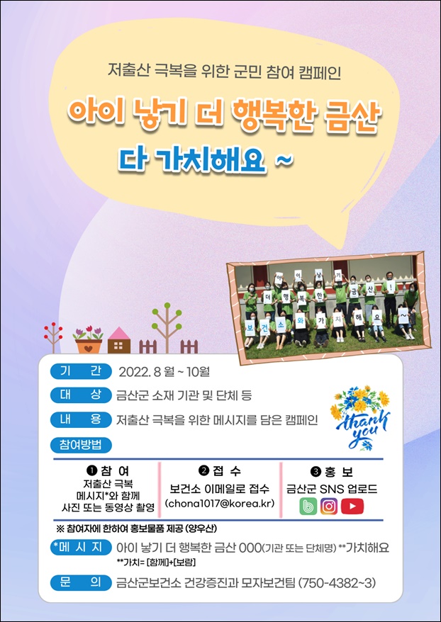 À̹ø Ä·ÆäÀÎÀº ±â°ü ¶Ç´Â ´Üü·Î Âü¿©ÇÒ ¼ö ÀÖÀ¸¸ç, ÀúÃâ»ê ±Øº¹ ¸Þ½ÃÁö¸¦ ´ãÀº µ¿¿µ»óÀ̳ª »çÁøÀ» Á¦ÀÛÇØ ±Ý»ê±ºº¸°Ç¼Ò ȨÆäÀÌÁö¿¡¼­ ´Ù¿î¹ÞÀº ½Åû¼­¿Í ÇÔ²² À̸ÞÀÏ(chona1017@korea.kr)·Î Á¦ÃâÇÏ¸é µÈ´Ù.