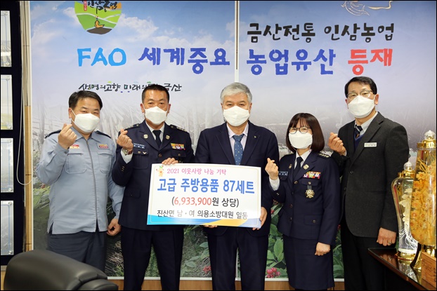 ±Ý»ê±º Áø»ê¸éÀÇ ³²ÀÚÀÇ¿ë¼Ò¹æ´ë(´ëÀå ÃÖÀçºÀ)¿Í ¿©ÀÚÀÇ¿ë¼Ò¹æ´ë(´ëÀå °­¿¬Èñ)°¡ Áö³­ 24ÀÏ °ü³» ¾î·Á¿î ÀÌ¿ô¿¡°Ô ÀüÇØ ´Þ¶ó¸ç 700¸¸ ¿ø »ó´çÀÇ »ýȰ¿ëǰ 87¼¼Æ®¸¦ ±Ý»ê±º¿¡ ±âŹÇß´Ù.
