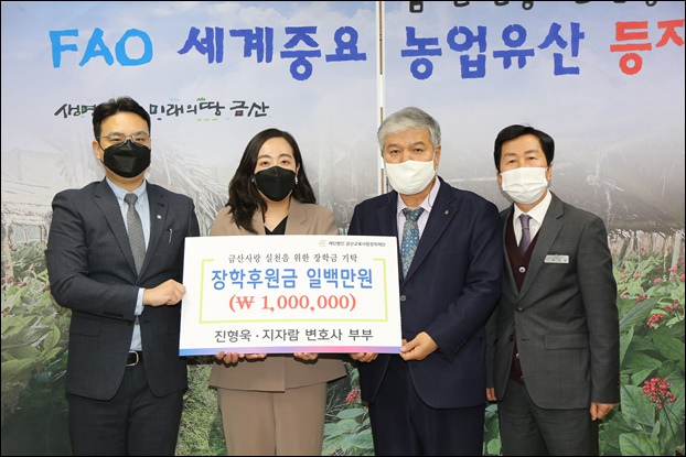 ÁøÇü¿í¡¤ÁöÀÚ¶÷ º¯È£»ç ºÎºÎµµ À̳¯ Áö¿ª ÈĹ踦 À§ÇØ ½á´Þ¶ó¸ç ±Ý»ê±³À°»ç¶ûÀåÇÐÀç´Ü¿¡ ÀåÇÐÈÄ¿ø±Ý 100¸¸ ¿øÀ» Àü´ÞÇß´Ù.
