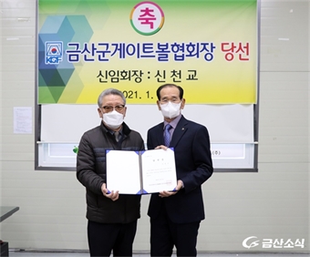 ±Ý»ê±º°ÔÀÌÆ®º¼Çùȸ À屿¿µ ¼±°Å°ü¸®À§¿øÀå(¿ÞÂÊ)ÀÌ ½Åõ±³ ½ÅÀÓȸÀå¿¡°Ô ´Ü¼±ÁõÀ» ±³ºÎÈÄ ±â³äÃÔ¿µÀ» Çϰí ÀÖ´Â ¸ð½À.±Ý»ê±º°ÔÀÌÆ®º¼Çùȸ ¼±°Å°ü¸®À§¿øÈ¸(À§¿øÀå À屿¿µ...