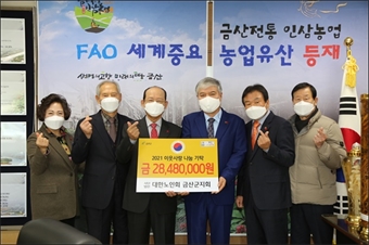 ¡ãÇѱ¹³ó¾÷Àΰ濵ÀÎ ±Ý»ê±º¿¬ÇÕȸ ÁÖÀçÇö ȸÀå(¿ÞÂÊ µÎ ¹øÂ°)ÀÌ ¼º±ÝÀ» Àü´ÞÇÏ°í ¹®Á¤¿ì ±Ý»ê±º¼ö(¿ÞÂÊ ¼¼ ¹øÂ°)¿Í ±â³ä»çÁøÀ» Âï°í ÀÖ´Ù. ±Ý»ê±ºÀº Çѱ¹³ó¾÷°æ¿µÀÎ...