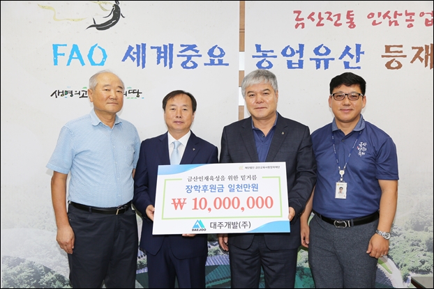 ±Ý»ê±º Áø»ê¸é¿¡ ¼ÒÀçÇÑ ´ëÁÖ°³¹ßÁÖ½Äȸ»ç(´ëÇ¥ÀÌ»ç ¿À¿ë´ë)°¡ (Àç) ±Ý»ê±³À°»ç¶ûÀåÇÐÀç´Ü¿¡ 1000¸¸ ¿øÀÇ ÀåÇбÝÀ» ÄèôÇß´Ù.